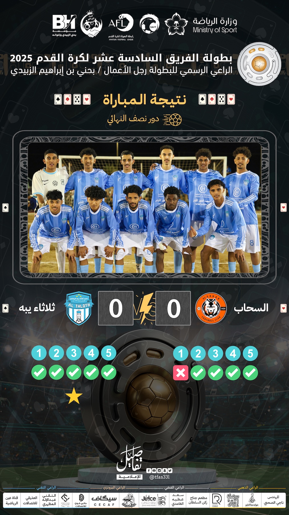 في نصف النهائي الثاني، فرض التعادل السلبي 0–0 نفسه على مواجهة ثلاثاء يبه و السحاب، في مباراة طغى عليها الانضباط الدفاعي وتألق حراس المرمى. واحتكم الفريقان إلى ركلات الترجيح، التي ابتسمت لصالح ثلاثاء يبه، ليضرب موعدًا مرتقبًا في النهائي. تحصل حارس فريق ثلاثاء يبه مديني الحسني على جائزة أفضل لاعب في المباراة بعد صمود وثبات ذهني وتألق في لحظات الحسم.