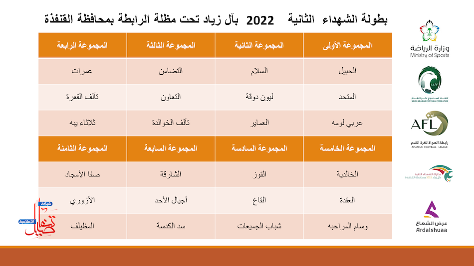 اقيمت مساء الخميس ٢٢ / ١٢ / ١٤٤٣ هـ مراسم قرعة بطولة الشهداء الثانية 2022 بآل زياد تحت مظلة رابطة فرق الهواة لكرة القدم بالقنفذة حيث ضمت القرعة ٢٤ فريق تم توزيعها على ٨ مجموعات كل مجموعة تحتوي على ٣ فرق، وسوف تنطلق مباريات البطولة في غرة شهر محرم بمشيئة الله تعالى.