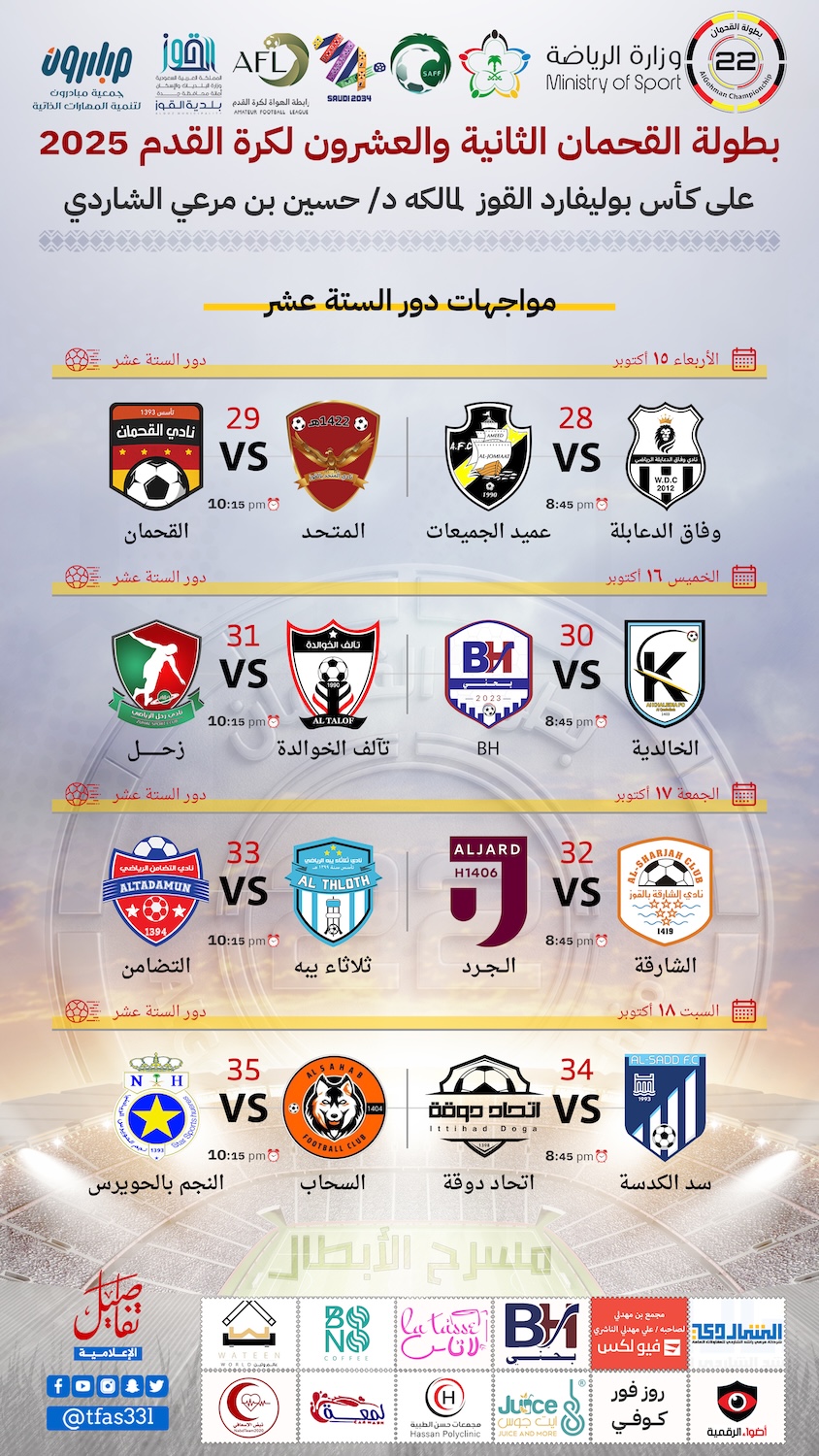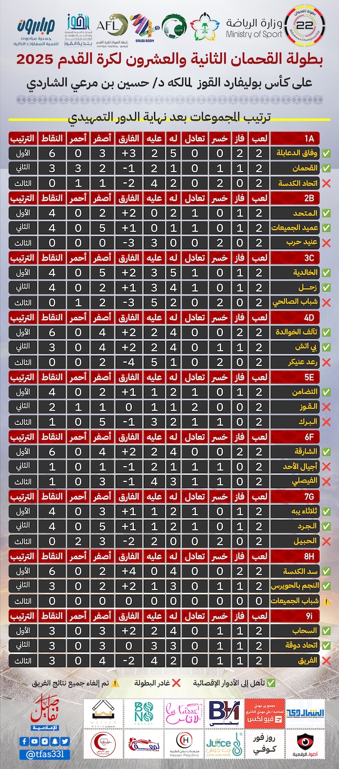 انتهت مباريات الدور التمهيدي لبطولة القحمان 22 على كأس بوليفارد القوز لرجل الأعمال الدكتور / حسين بن مرعي الشاردي بثلاث مباريات أقيمت مساء الجمعة حيث تمكن فريق عميد الجميعات من تحقيق الفوز على فريق عنيد حرب بهدف سجله إبراهيم مايغا هذا الهدف ضمن لفريق العميد التواجد في الدور القادم وصيف للمجموعة الثانية بـ 4 نقاط.