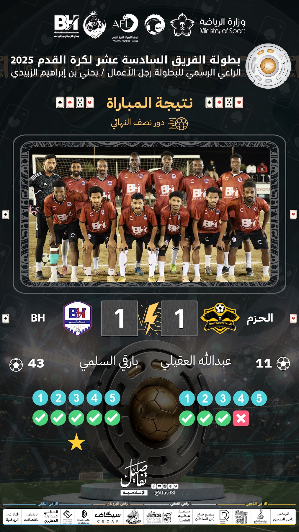 ضمن منافسات دور نصف النهائي من بطولة الفريق السادسة عشر لكرة القدم 2025، المقامة برعاية رجل الأعمال بحني بن إبراهيم الزبيدي، شهدت الجولة قمتين ناريتين حبست الأنفاس حتى ركلات الترجيح، وأسفرت عن تأهل BH وثلاثاء يبه إلى المشهد الختامي.
