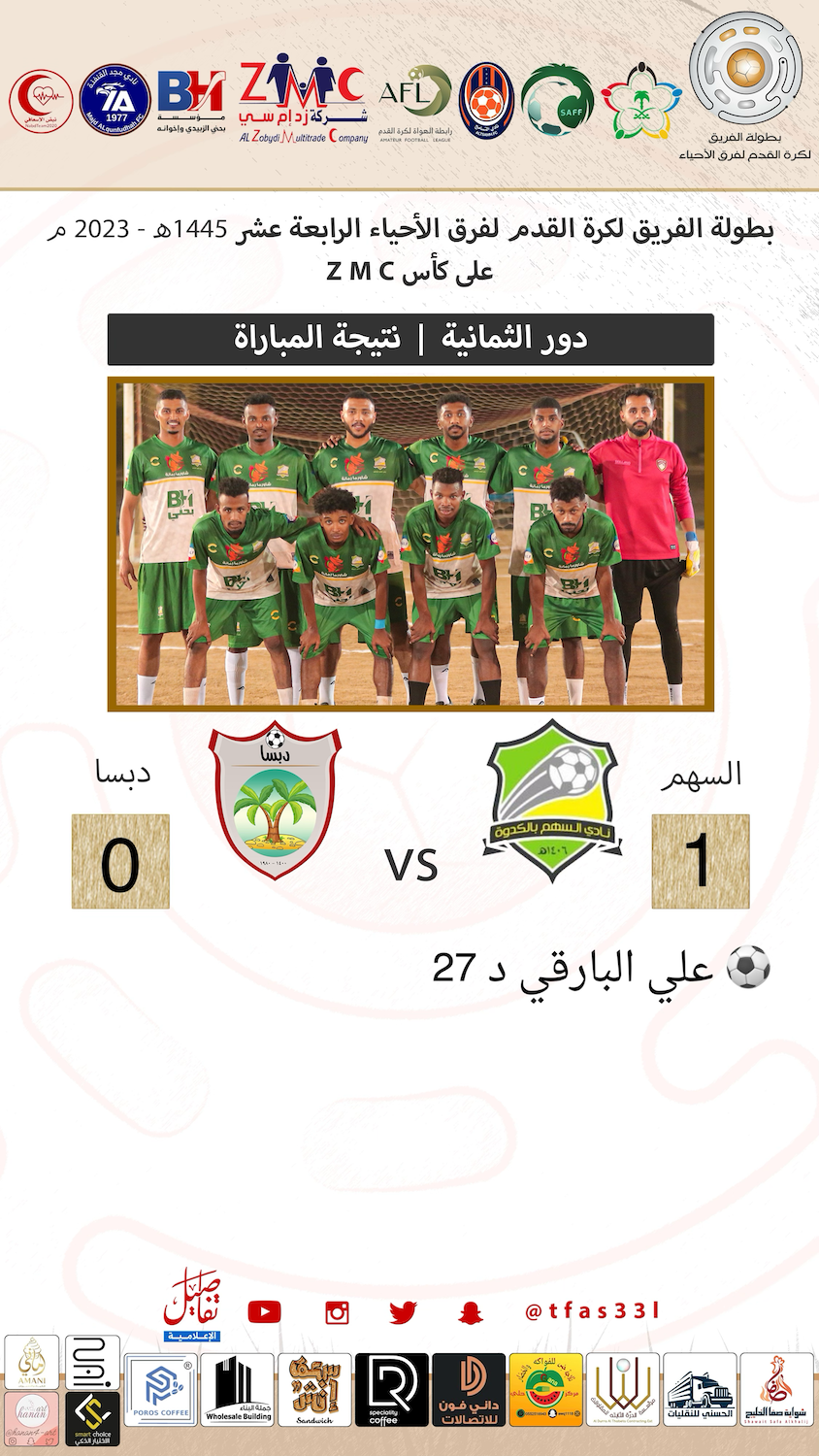 انتهت المباراة التي جمعت بين فريق السهم وفريق دبسا ضمن مباريات دور الثمانية بفوز فريق السهم بهدف مقابل لا شيء جاء الهدف عن طريق نجم المباراة وهداف البطولة إلى الآن علي البارقي في الدقيقة 27 من زمن المباراة، وبهذا الفوز يصل السهم إلى دور نصف النهائي ومواجهة الفائز من مباراة عميد ألمع والعربي.
