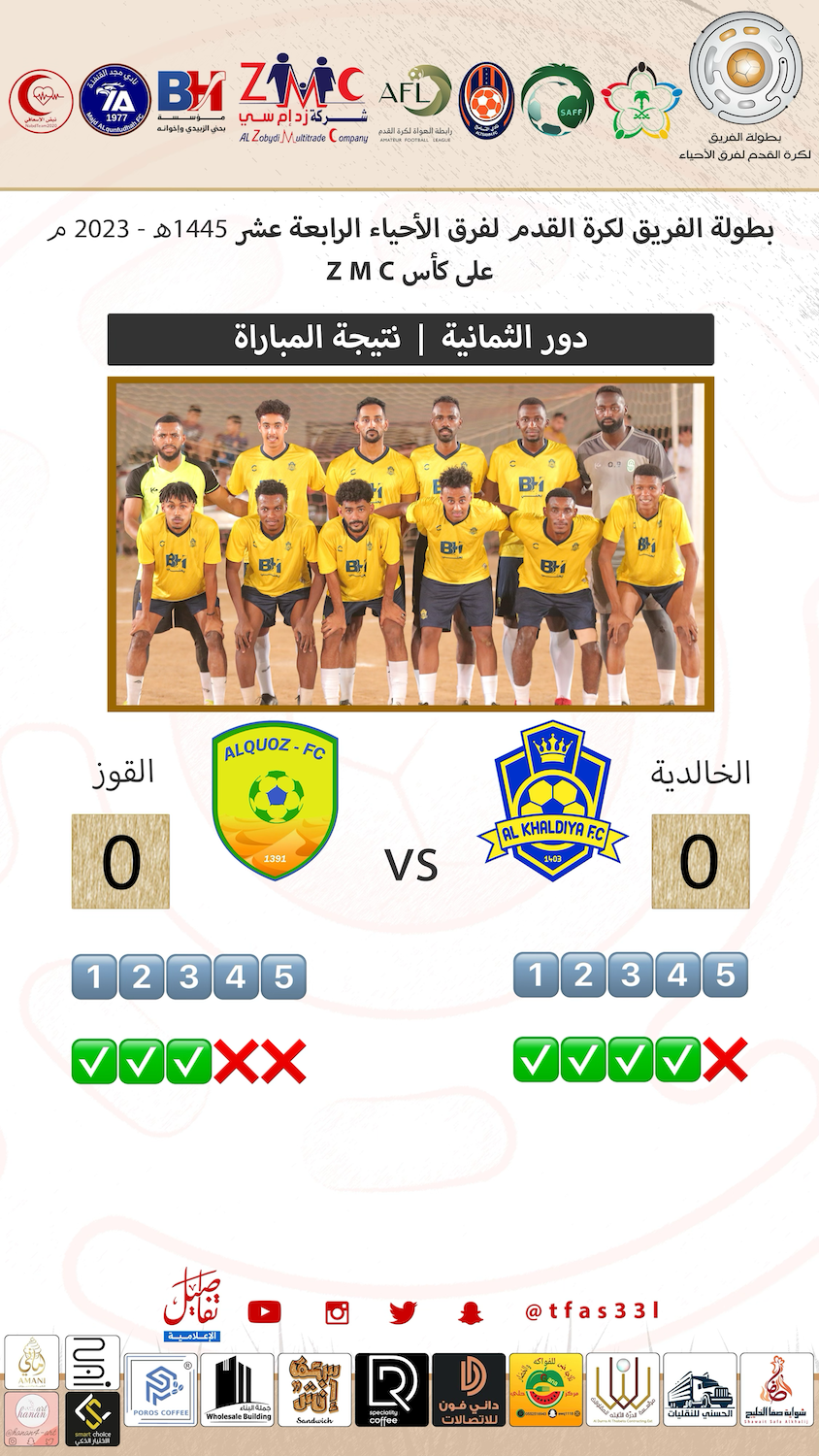 وفي المباراة الثانية تمكن فريق الخالدية من الفوز على فريق القوز بركلات الترجيح ٤-٣ بعد التعادل السلبي في الأشواط الأصلية، بهذا الفوز يحجز الخالدية مقعداً في دور نصف النهائي ومواجهة الفائز من مباراة الفريق ووحدة عنيكر.