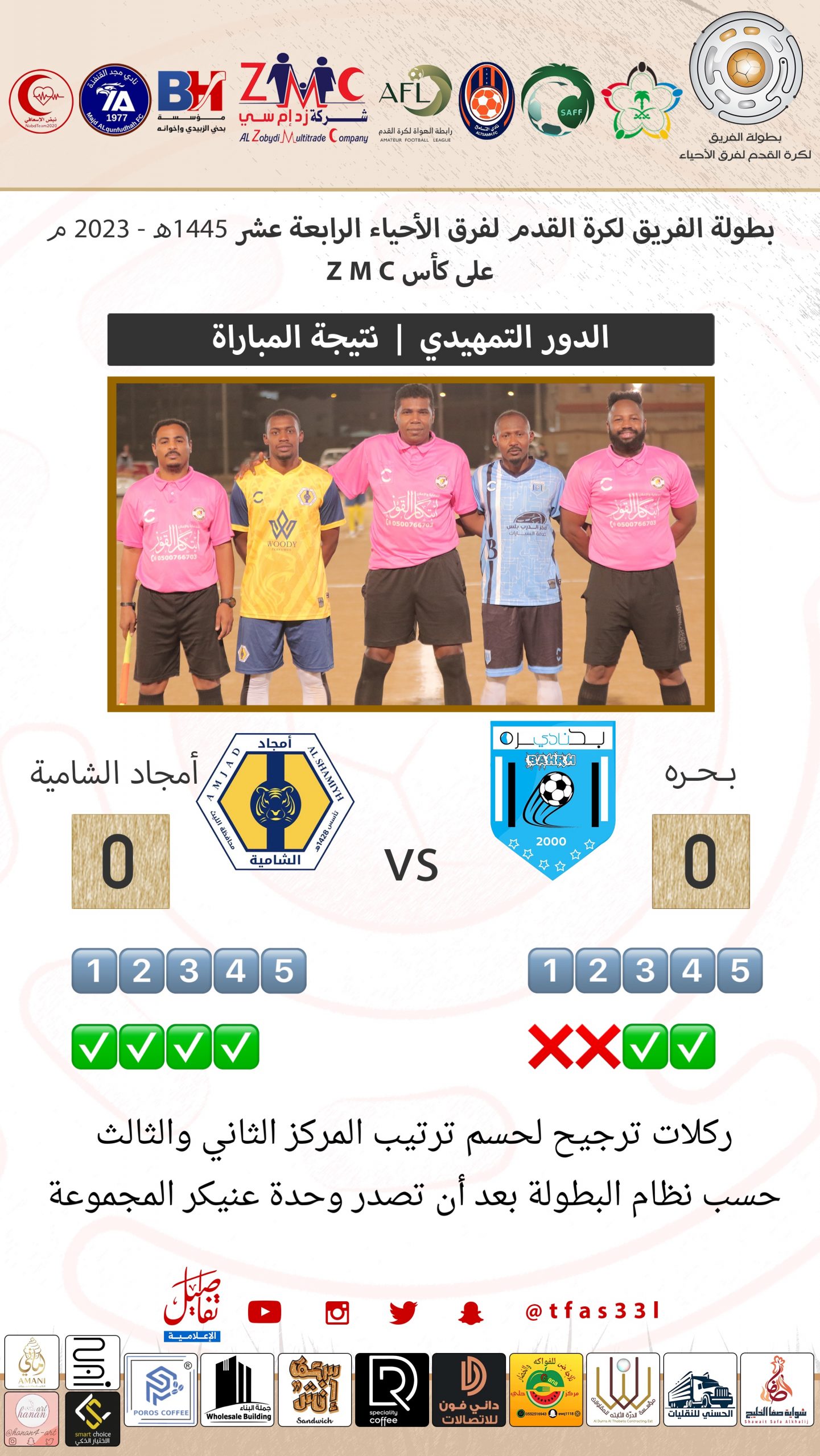 انتهت المباراة التي جمعت بين فريق بحره وفريق أمجاد الشامية بالتعادل السلبي بدون أهداف ، هذا التعادل جعل وحدة عنيكر يتصدر المجموعة بنقطتين والأمجاد ثانياً وبحره ثالثاً بعد الاحتكام لركلات الترجيح التي انتهت ( ٤-٢ ) لصالح الأمجاد.