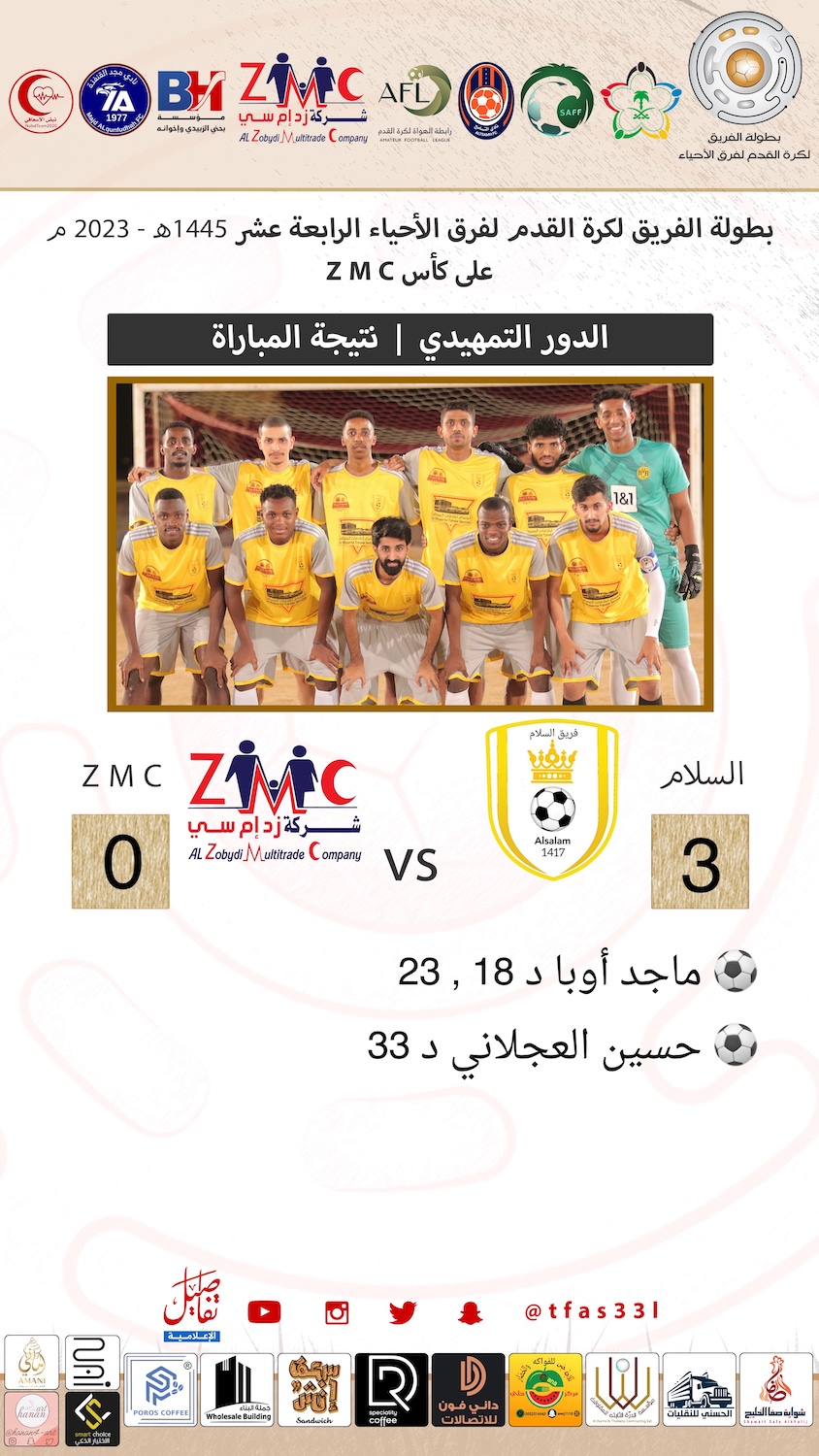 وفي المباراة الثانية التي جمعت بين فريق السلام وفريق ZMC انتهت بفوز السلام بثلاثة أهداف مقابل لا شيء افتتح التسجيل نجم المباراة اللاعب ماجد أوبا أول أهداف السلام في الدقيقة 18 وأضاف الهدف الثاني في الدقيقة 23 واختتم اللاعب حسين العجلاني ثلاثية السلام في الدقيقة 33 وبهذه النتيجة يحل السلام في وصافة المجموعة بأربع نقاط و ZMC يغادر البطولة بصفر نقاط، فيما يحتل فريق السهم صدارة المجموعة بفارق الأهداف عن السلام.