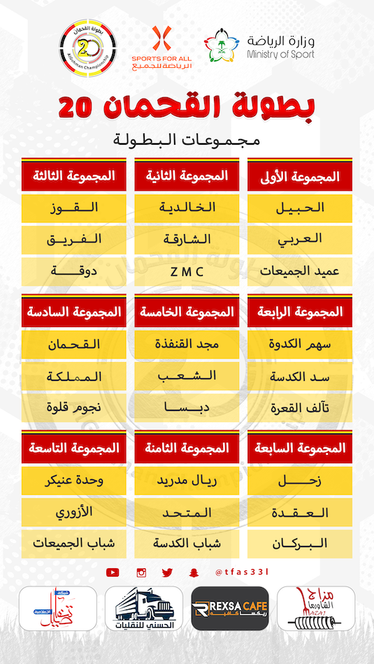 تنطلق مساء الخميس ٢٠ / ٤ / ١٤٤٣ هـ بطولة القحمان والتي ضمت ٢٧ فريق تم توزيعها على ٩ مجموعات كل مجموعة تحتوي على ثلاث فرق، وتحمل هذه النسخة الرقم ٢٠ من تاريخ بطولات القحمان حيث ذكر رئيس اللجنة المنظمة الأستاذ / حسن القحماني بأن هذي النسخة سوف تكون استثنائية في كل شيء ونوعد الجمهور الرياضي بتقديم بطولة قوية يستمتع بها كل من حضر إلى ملعب القحمان.