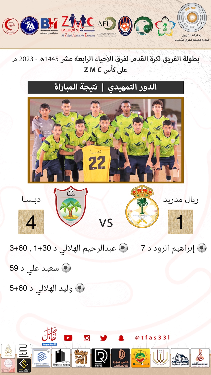 انتهت المباراة التي جمعت بين فريق ريال مدريد وفريق دبسا بفوز فريق دبسا بأربعة أهداف مقابل هدف ، تقدم الريال مبكراً عن طريق اللاعب إبراهيم الرود في الدقيقة 7 ، واستطاع فريق دبسا من تسجيل هدف التعادل قبل نهاية الشوط الأول عن طريق نجم المباراة عبدالرحيم الهلالي، وفي الشوط الثاني تحصل لاعب ريال مدريد عماد كانتي على البطاقة الحمراء بعد تدخل عنيف على لاعب دبسا وبعدها بدقائق يشهر الحكم أحمد عبده البطاقة الصفراء الثانية ثم الحمراء للاعب الريال أيمن الجعفري استغل دبسا هذا النقص العددي واحكم السيطرة على المباراة وتمكن من خلق فرص خطيرة على مرمى الريال حتى تمكن من تسجيل ثلاثة أهداف في الدقائق الأخيرة من المباراة حملت توقيع سعيد علي وعبدالرحيم الهلالي ووليد الهلالي، بهذا الفوز ينتزع دبسا صدارة المجموعة بـ ٤ نقاط ويصل إلى الدور القادم ويغادر ريال مدريد البطولة وينتظر فريق البرك حسابات المجموعات الأخرى.